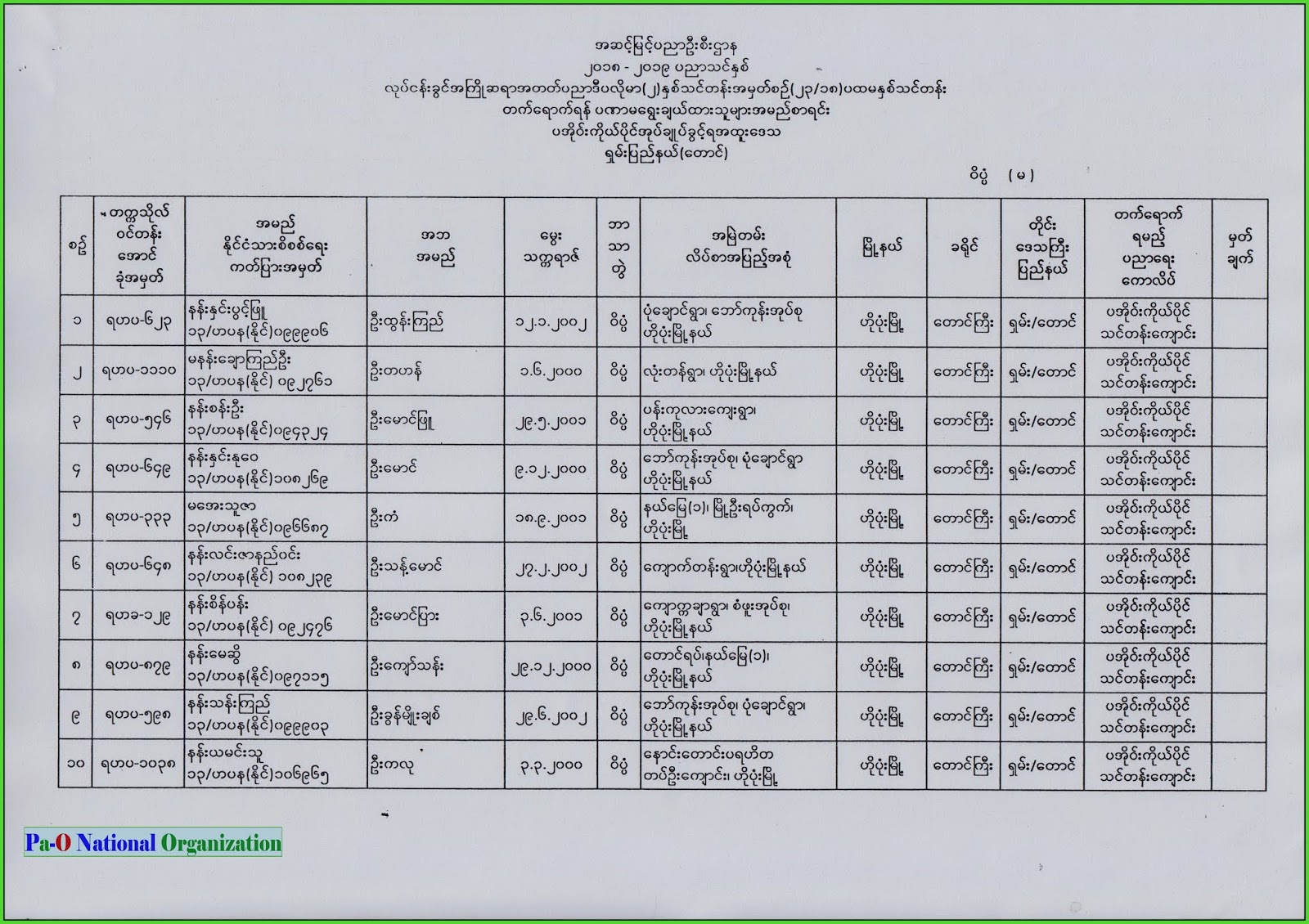 ပအုိ၀္းကုိယ္ပုိင္အုပ္ခ်ဳပ္ခြင့္ရေဒသ ၂၀၁၈-၂၀၁၉ ပညာသင္ႏွစ္ လုပ္ငန္းခြင္အႀကိဳဆရာအတက္ပညာဒီပလုိမာ (၂)ႏွစ္သင္တန္းအမွတ္စဥ္ (၂၃/၁၈)ပထမႏွစ္သင္တန္း တက္ေရာက္ရန္ မဏာမေ႐ြးခ်ယ္ထားသူမ်ားအမည္စားရင္း